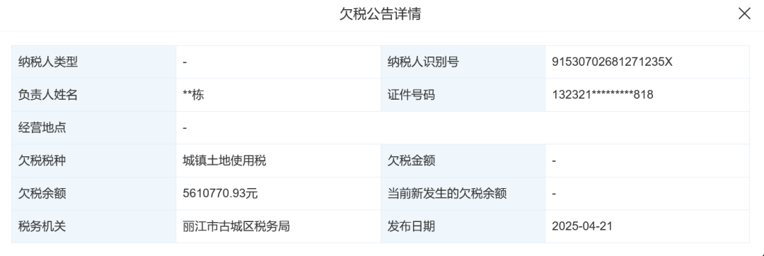 4月21日,该公司新增1条欠税公告,欠税余额为561万余元,欠税税种为城镇土地使用税,税务机关为丽江市古城区税务局。