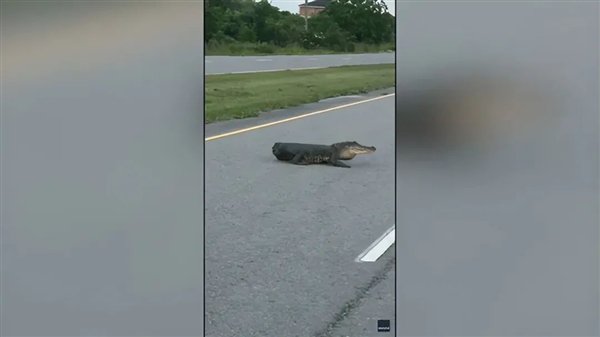 乍一看,以为是一只宠物犬,车开到近处,才发现是一条鳄鱼,而且是一条缺失了整条尾巴的鳄鱼。