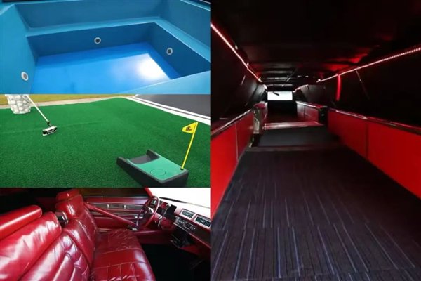 最显眼的就是车尾的设计,一个游泳池,一个真的可以停直升机的停机坪,以及一个“迷你型”的高尔夫球场。
