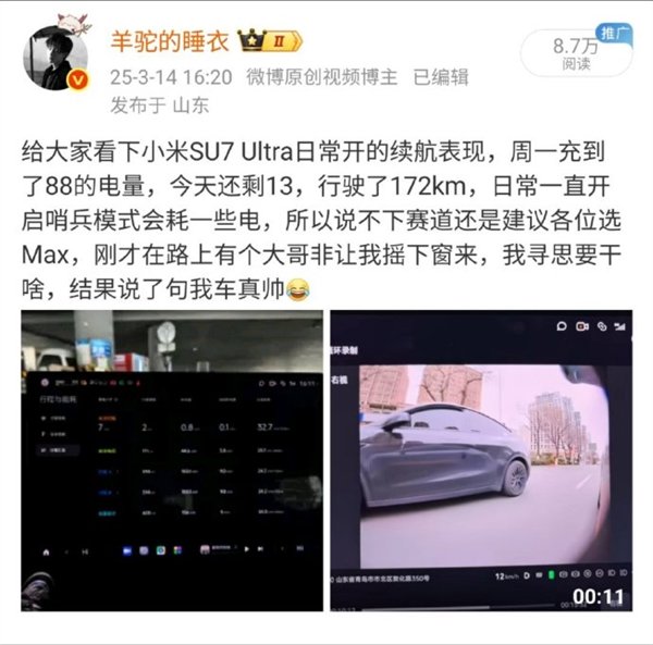 快科技5月28日消息,B站UP主“羊驼的睡衣”昨晚分享了小米SU7 Ultra的使用心得。