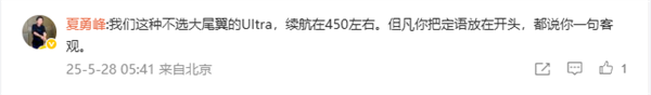 对此,小米SU7 Ultra车主蜂巢科技 创始人兼CEO夏勇峰驳斥到:“我们这种不选大尾翼的Ultra,续航在450左右。但凡你把定语放在开头,都说你一句客观。”