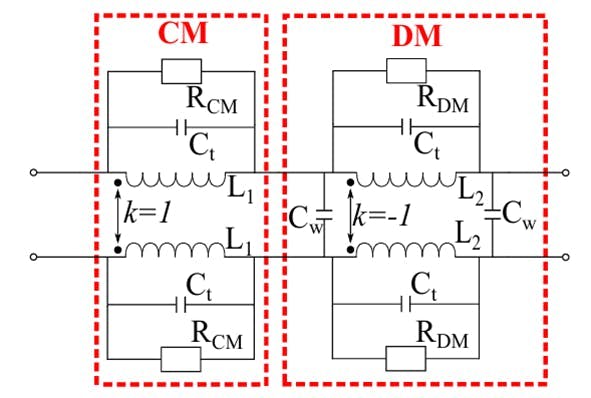 首选设计是使用更精确的电路,它分别考虑了 CMC 在共模和差模下的行为不同,这在单独的共模和差分模块中进行了描述(图 8)。