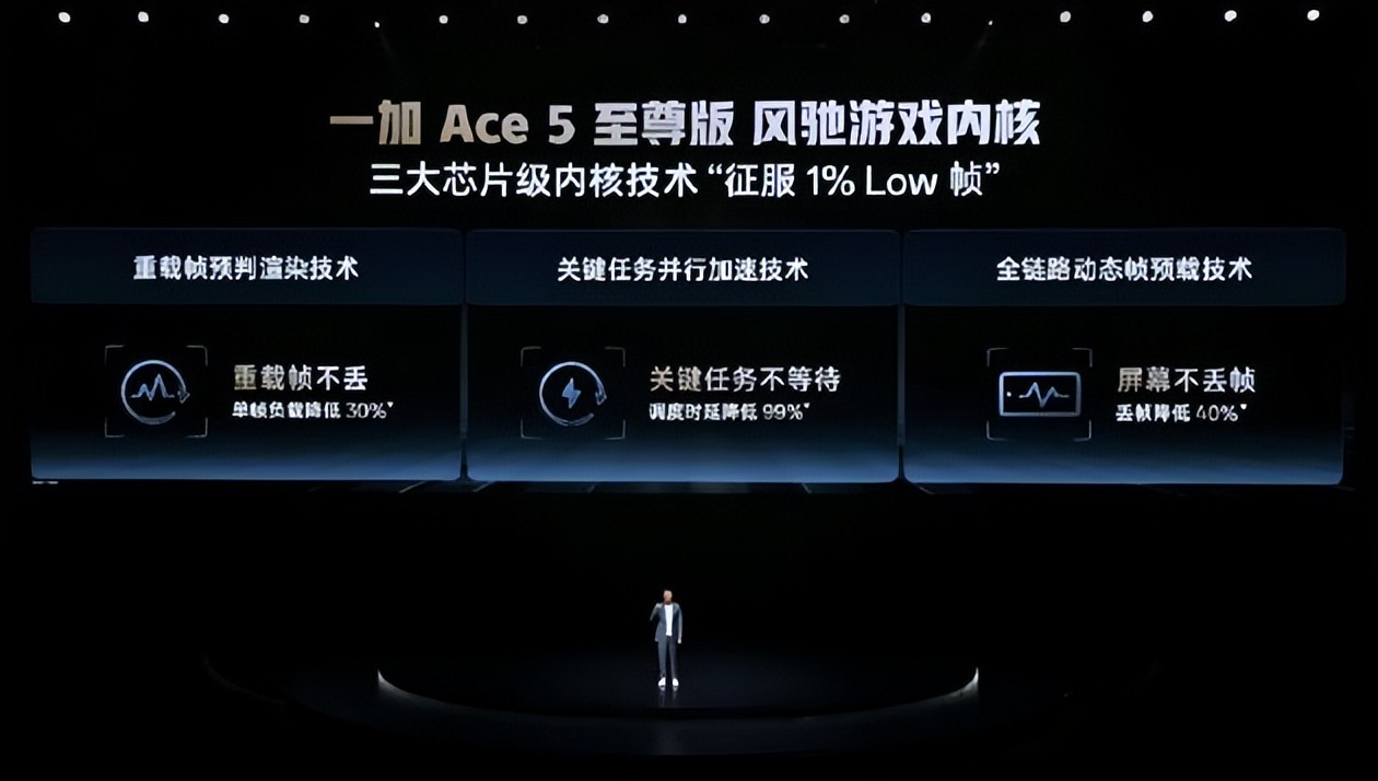为解决“平均帧率接近满帧但游戏仍卡顿”的手游体验痛点,一加将PC级游戏评测标准1% Low帧纳入手机游戏体验的衡量标准中。1% Low 帧指的是把一段游戏的帧数从高到低排序,取到最低的 1% 帧的帧率平均值。虽然 1% Low 帧出现的时间很短,但它往往出现在团战激烈时刻、钢枪对决瞬间、Boss 战等游戏关键时刻,对于整局游戏的流畅体验至关重要。1%Low帧是最能反映游戏真实流畅度的帧率指标,所以真正的流畅游戏体验,既要看‘平均帧率’,更要看‘ 1% Low 帧’。一加Ace 5 至尊版在平均帧率满帧之上,得益于三大芯片内核技术,继续征服1%Low帧,挑战消灭游戏卡顿的最后一公里。在《王者荣耀》10v10 龙坑团战、《星铁》大规模地图奔跑测试和《原神》血战 Boss 等重载游戏场景中,一加Ace 5 至尊版1%Low帧表现均可挑战行业最强。行业内只有一加Ace 5 至尊版才能同时做到平均帧率行业最高,1%Low帧行业最优。