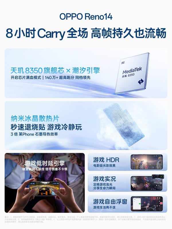在性能方面,Reno14 Pro 搭载新一代天玑旗舰芯天玑 8450,采用全大核架构与 4nm 先进制程工艺,配合OPPO独有的潮汐引擎调校,即使在重度游戏或多任务处理场景下,也能始终保持流畅运行;Reno14 采用的天玑8350处理器也同样有着出色的性能表现。全系均配备新一代天工散热系统,双层石墨 + 5400mm² 超大 VC 三层散热材料组合,结合纳米流体强化传热技术,有效解决了手机发热问题,即使长时间玩大型游戏,也能保持高帧率、低温度,带来畅快的使用体验。