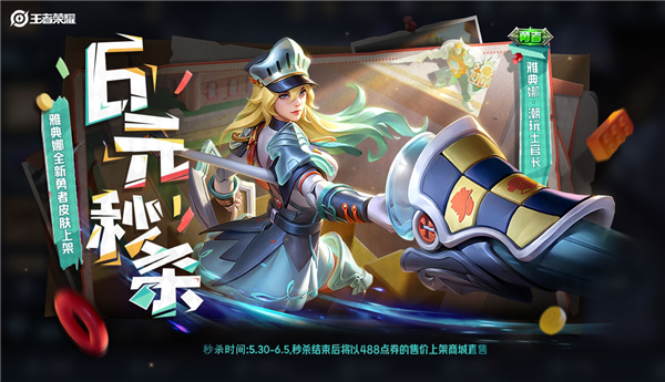 快科技5月28日消息,《王者荣耀》又一款6元秒杀皮肤来了,它就是雅典娜-潮玩士官长。