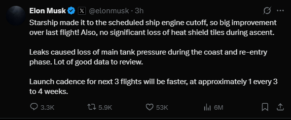 马斯克随后在社交平台X上发帖表示:“星舰成功完成预定主发动机关机程序,较上次试飞取得重大进步,此外,上升阶段未出现大面积隔热瓦脱落现象,滑行段与再入阶段因燃料泄漏导致主贮箱失压,但已获取大量有效数据可供分析。”