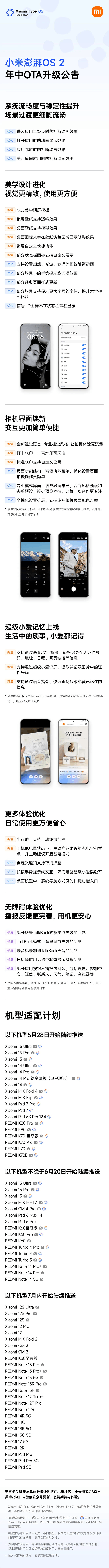 小米于5月28日发布澎湃OS 2年中升级公告,宣布首批设备今日起将陆续收到更新推送。