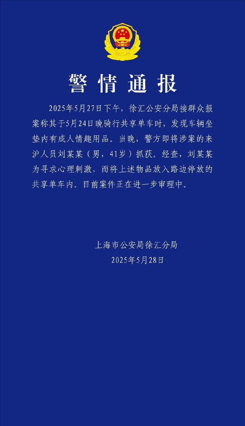 新京报贝壳财经讯(记者 俞金旻)5月28日,记者从上海徐汇警方获悉,27日下午,徐汇公安分局接群众报案称其于5月24日晚骑行共享单车时,发现车辆坐垫内有成人情趣用品。当晚,警方即将涉案的来沪人员刘某某(男,41岁)抓获。经查,刘某某为寻求心理刺激,而将上述物品放入路边停放的共享单车内。目前案件正在进一步审理中。