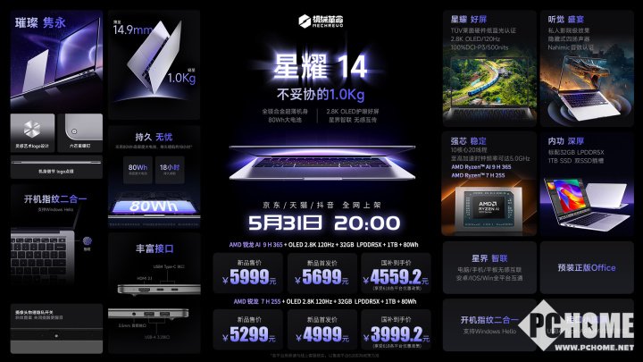 在昨晚举办的「耀见星程」的新品发布会上,机械革命正式发布了其全新的星耀14超轻薄本,采用全镁合金机身,重量仅有1kg,还搭载2.8K 120Hz三星OLED屏幕,处理器可选AMD锐龙AI 9 H 365及锐龙7 H 255,成为机械革命超轻薄本新标杆。目前该款笔记本已经在国内平台上架开启预约,锐龙AI 9 H 365+32GB内存+1TB SSD版本定价5999元,首发价5699元,国补后4559.2元;锐龙7 H 255+32GB内存+1TB SSD版本定价5299元,首发价4999元,国补后3999.2元。首发预装正版Office家庭和学生版,提供3年延保、提供12个月免息分期,晒单还可享好礼。