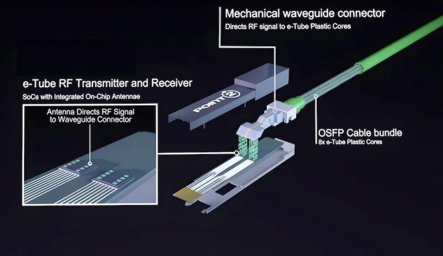 采用普通低密度聚乙烯(LDPE)材料制造的 e-Tube 电缆不会受到高频损耗的影响,这使得 e-Tube 成为一种可扩展的互连,因为它可用于从 56G 到 224G 及更高速率的数据传输。用于数据传输的低功耗射频发射器和接收器 IC 实现了行业最佳的 3 皮焦耳/比特能效,并且只有皮秒级延迟。