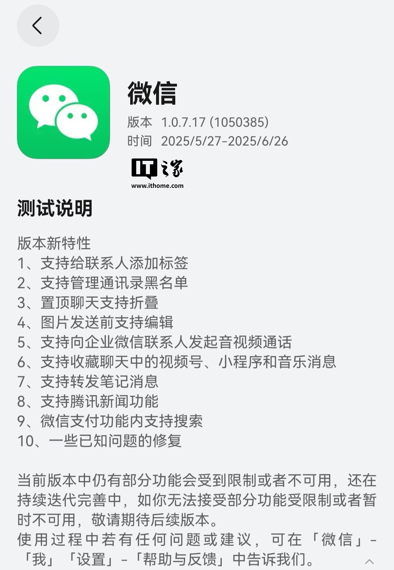此次更新的功能列表与此前发布的 1.0.7.16 版本基本一致,主要包括以下优化和新增功能:支持为联系人添加标签;支持管理通讯录黑名单;置顶聊天支持折叠;发送图片前可进行编辑操作;支持向企业微信联系人发起音视频通话;支持收藏聊天中的视频号、小程序和音乐消息;支持转发笔记内容;腾讯新闻功能继续提供服务;微信支付页面增加搜索功能;此外还修复了一些已知问题。