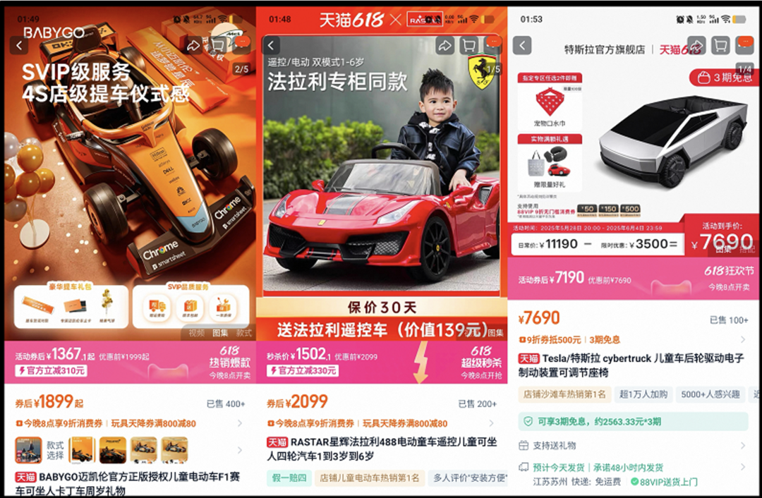 相关工作人员介绍,近年来,拿到官方授权的童车品牌越来越多,据不完全统计,目前平台上在售的儿童电动车品牌,不少拿到了兰博基尼、迈凯伦、玛莎拉蒂等名车的官方授权,甚至特斯拉自己在官方旗舰店上架了cybertruck的童车。