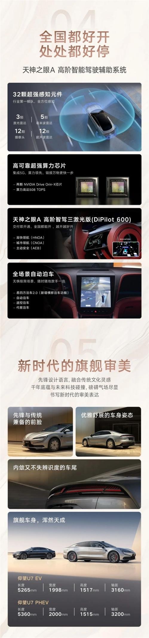 辅助驾驶方面,仰望U7标配两颗英伟达Orin-X智驾芯片,算力共达508TOPS,配备3颗超远距离激光雷达、5颗毫米波雷达、13颗高清摄像头以及12颗超声波雷达,可实现L2+高阶智驾辅助能力。