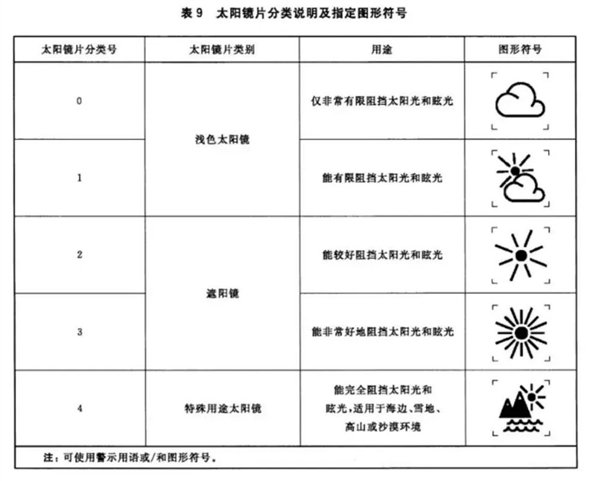 其中 Cat 也写作镜片分类号,表示不同情况下的不同种类太阳镜使用情况。对于户外使用,选择第 3 类就足够了。