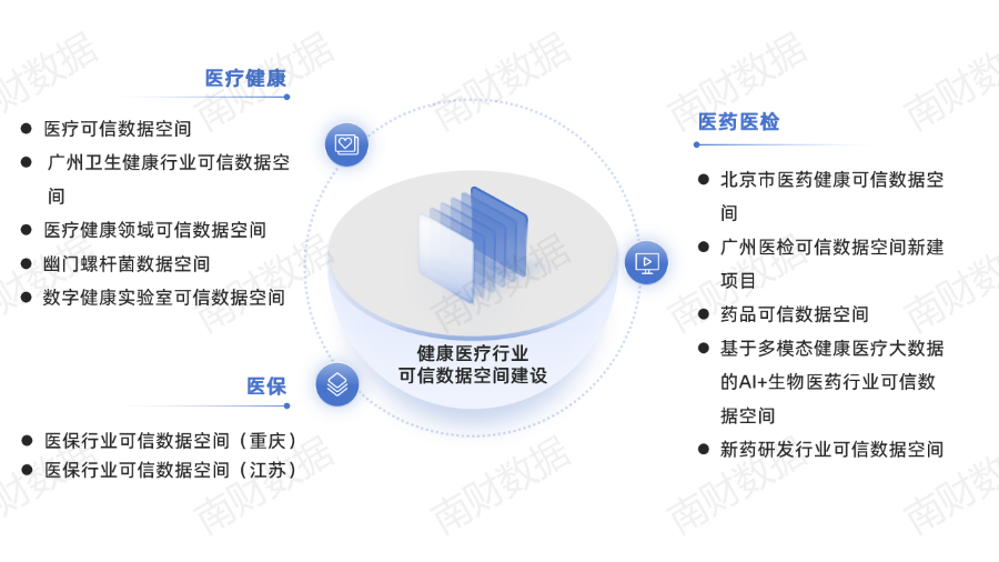 在已公开披露的建设项目中,健康医疗行业部署最深入、数量最多,尤其京广两地积极打造医疗医药可信数据空间。如北京电子数智科技有限责任公司与中日友好医院联合打造医疗可信数据空间;广州市卫生健康委员会牵头建设广州卫生健康行业可信数据空间,发布了5个数据产品和28个高质量数据集。
