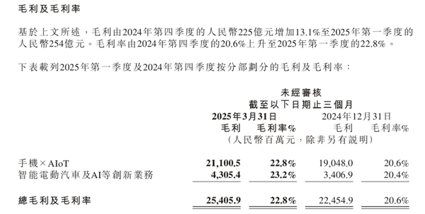 财报显示,小米汽车所在的智能电动汽车及 AI 等创新业务分部,2025年第一季度亏损5亿元,但毛利率已经超过了集团整体水平,达到了23.2%。