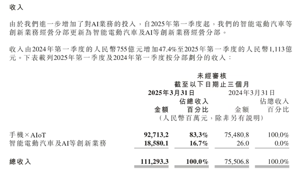 根据财报,小米集团在2025年第一季度收入为1112.93亿元,较2024年第一季度的754.8亿元同比增长47.4%,已经是连续两个季度突破千亿。