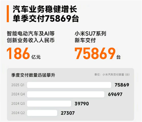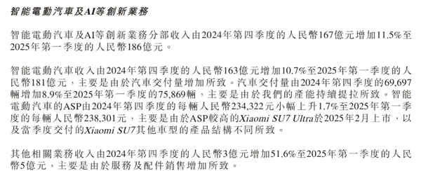 2025年一季度,小米集团的智能电动汽车及AI等创新业务分部收入186亿元,占2025年第一季度小米集团总收入的16.7%。