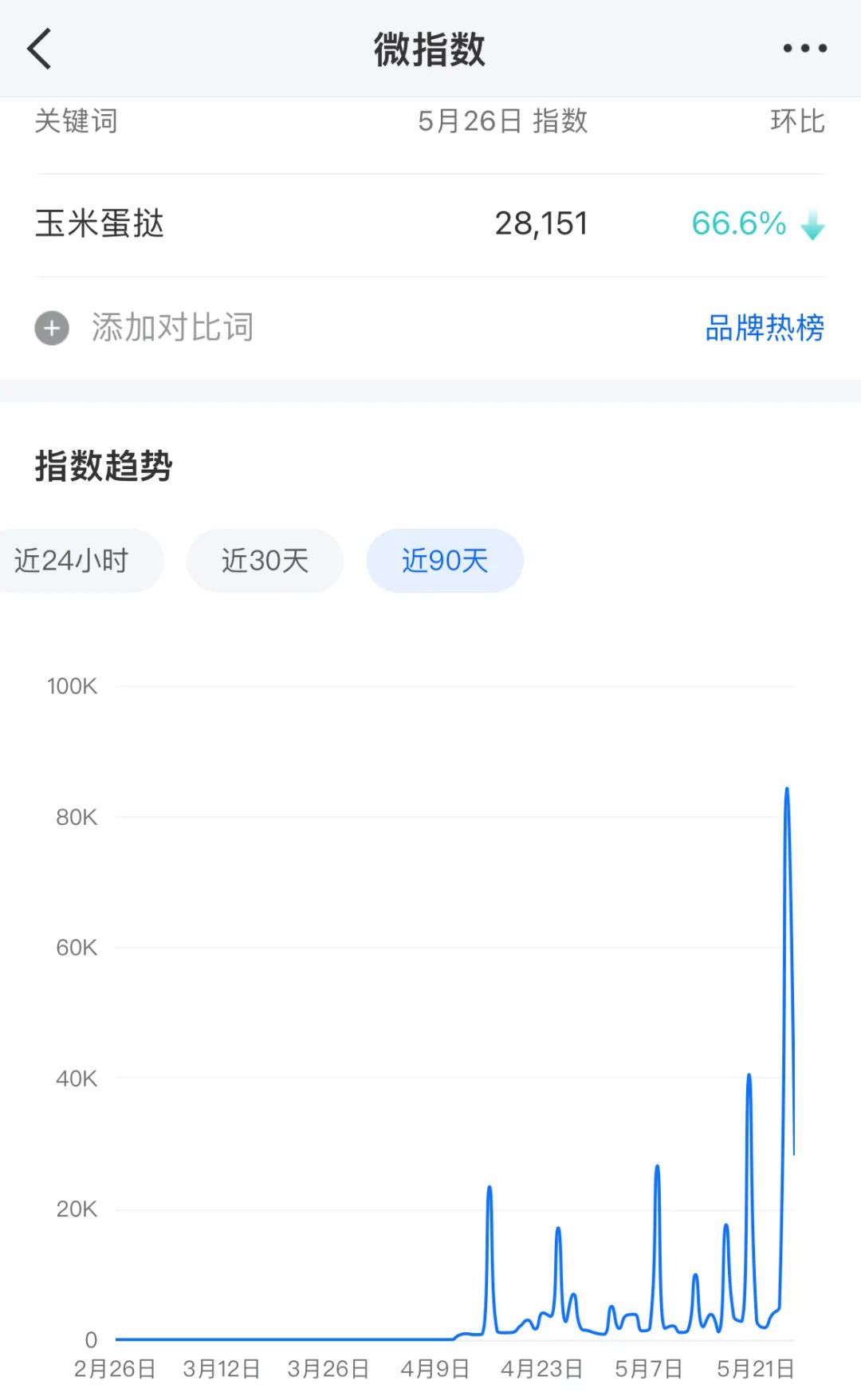 微博指数数据显示,从今年4月开始,玉米蛋挞就略有热度,直到5月彻底成为热议话题。
