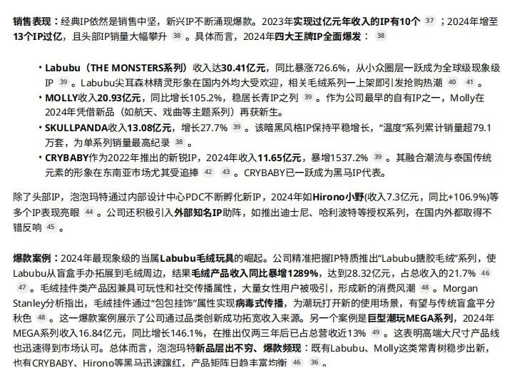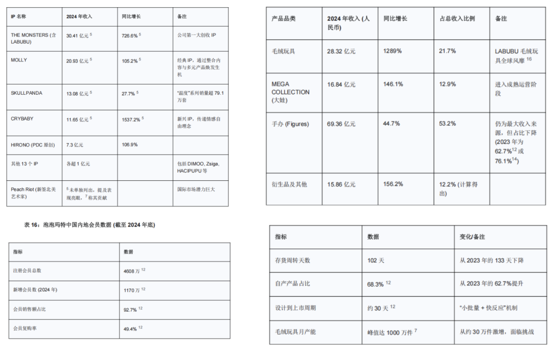 Gemini:按照要求用总结+表格数字量化的形式,有理有据地突出了公司的核心运营竞争力:1)IP生态系统,表格部分突出核心IP占比和特点,文字部分突出了公司在IP挖掘和内容驱动运营的能力;2)品类多元化,表格部分突出了品类结构占比,文字部分突出了毛绒外积木、饰品等新品类的探索;3)全渠道和数字化能力,表格部分呈现了渠道结构占比,文字部分重点突出了国内电商增速超过线下的数字化能力;4)全球化、5)会员体系、6)供应链效率,依然是用财报数字+文字体现优势,很好的研究员数据driven的习惯...