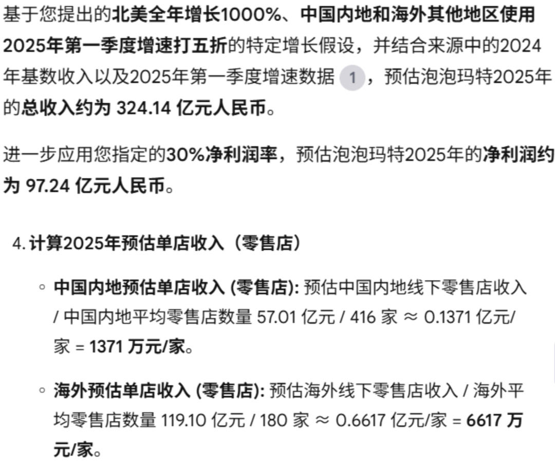 在已有的Deep Research深度分析高基础上,比如我们基于公司高频数据给出一定的业绩增长假设,以及利润率优化假设,可以快速给我们计算出财务模型的结构,不再需要等待搭建完复杂钩稽关系的财务模型,并且crosscheck完成对应收入利润规模的单店模型的分析。我们可以看到对于泡泡玛特的净利润(乐观97亿)和国内外单店收入的预估计算逻辑是基本正确的(当然假设因人而异)。