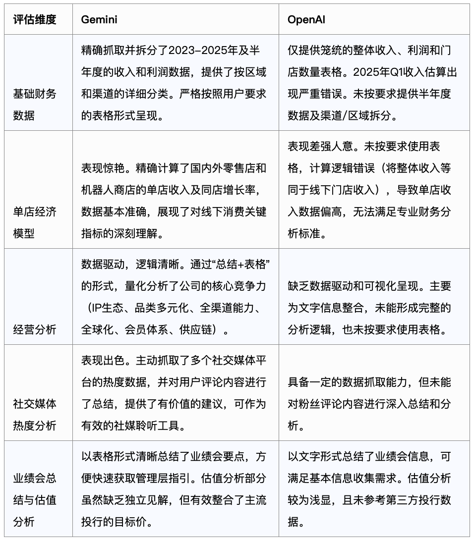 相比之下,OpenAI虽然能够完成基础的信息提取和总结,但在数据的准确性、分析的深度以及按照特定要求(如表格化、精细化拆分)进行输出方面,与Gemini存在明显差距,其产出更偏向于宏观层面的信息整合,难以满足二级市场对财务模型苛刻的精度要求。