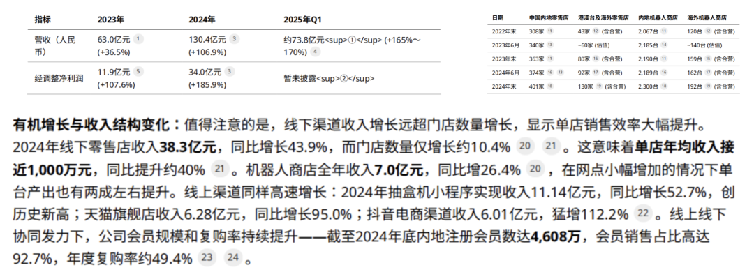 2.请包含表格反映2023-2025最新的财务数字(包括半年度和年度的收入、利润、门店数量增长情况;季度各渠道收入增速情况);