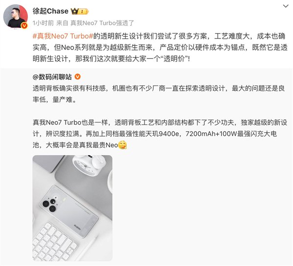 今天,数码圈因一则微博互动掀起热议。知名爆料博主“数码闲聊站”发文指出,手机透明背板虽科技感十足,但受限于良率低、量产难,始终是行业“高风险赛道”,并提及真我Neo7 Turbo在透明背板工艺和内部结构都下了不少功夫。