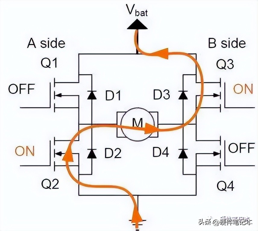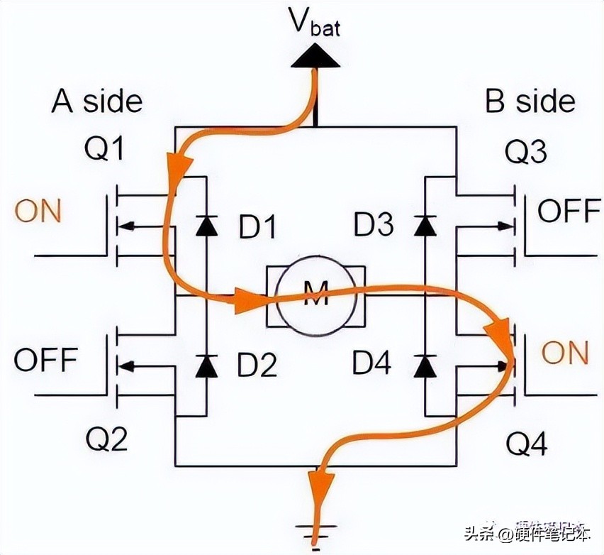 因为电路长得像字母H而得名,通常它会包含四个独立控制的开关元器件,例如下图有四个MOSFET开关元器件Q1、Q2、Q3、Q4。
