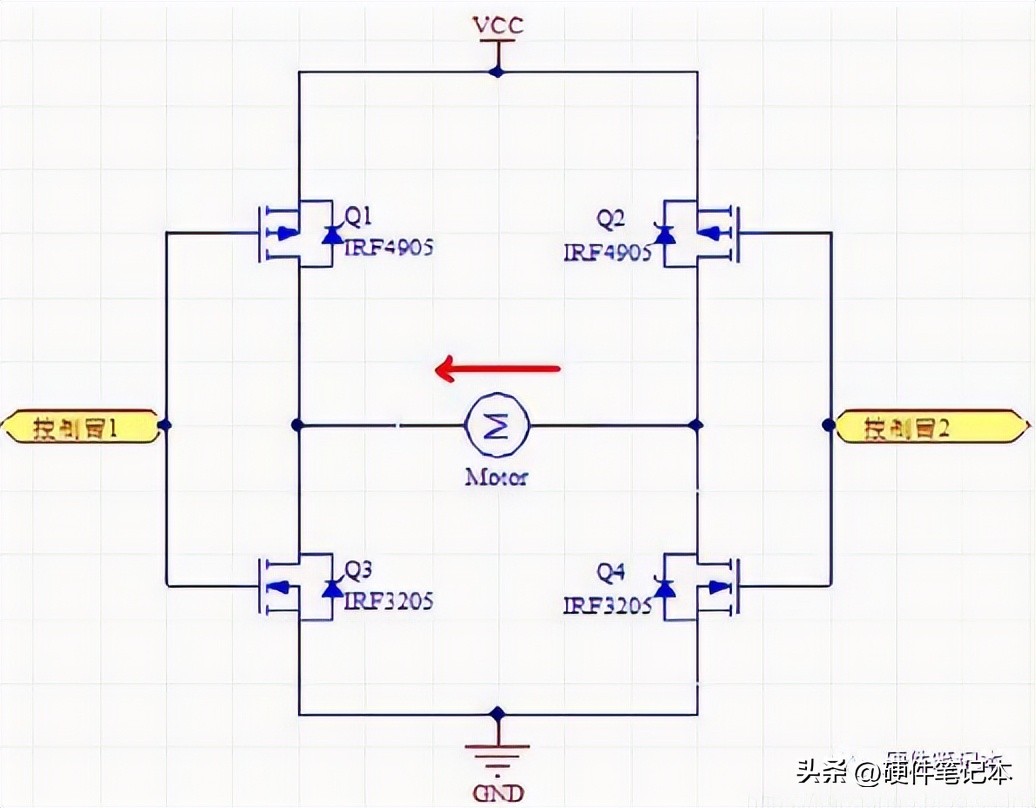 正因为这个特点,在连接好上图电路后,控制臂1置高电平(U=VCC)、控制臂2置低电平(U=0)时,Q1、Q4关闭,Q2、Q3导通。