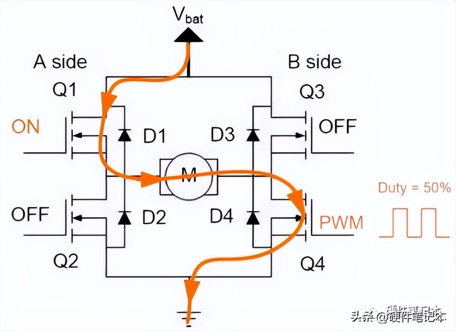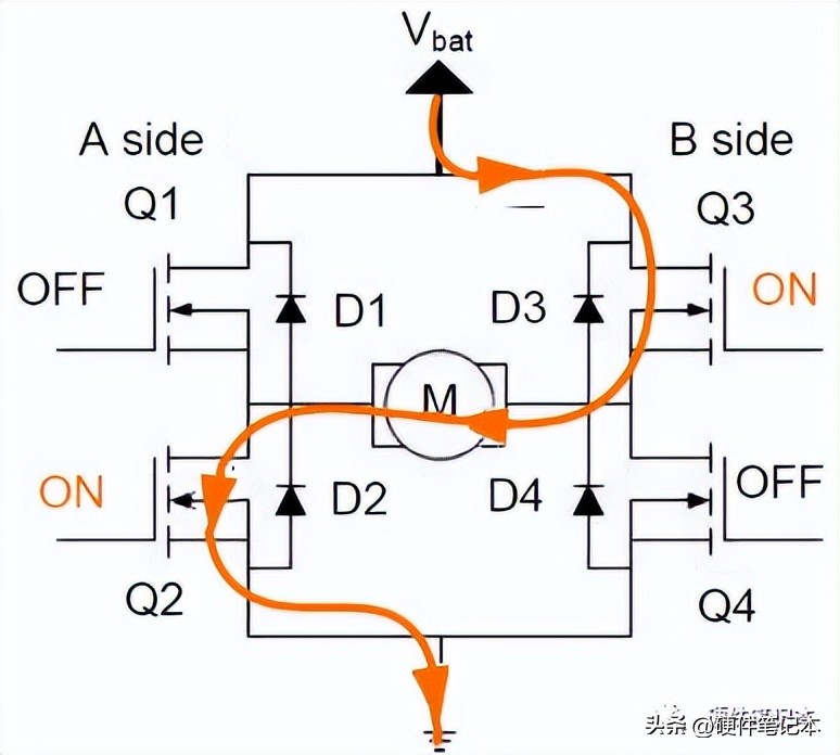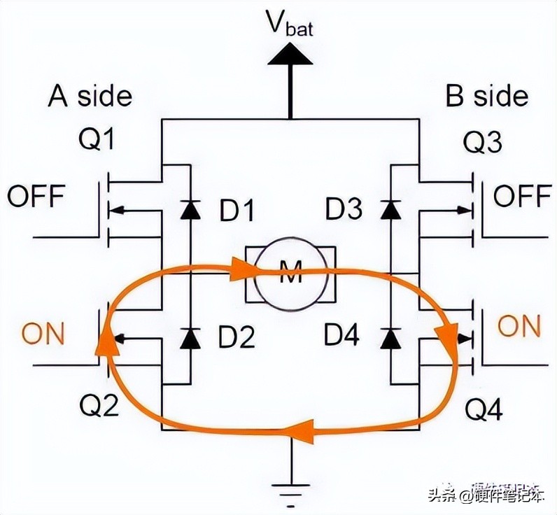准备停止的时候,关闭Q1、打开Q2,这时候电流并不会衰减地很快,电流循环在Q2、M、Q4之间流动,通过MOS-FET的内阻将电能消耗掉。