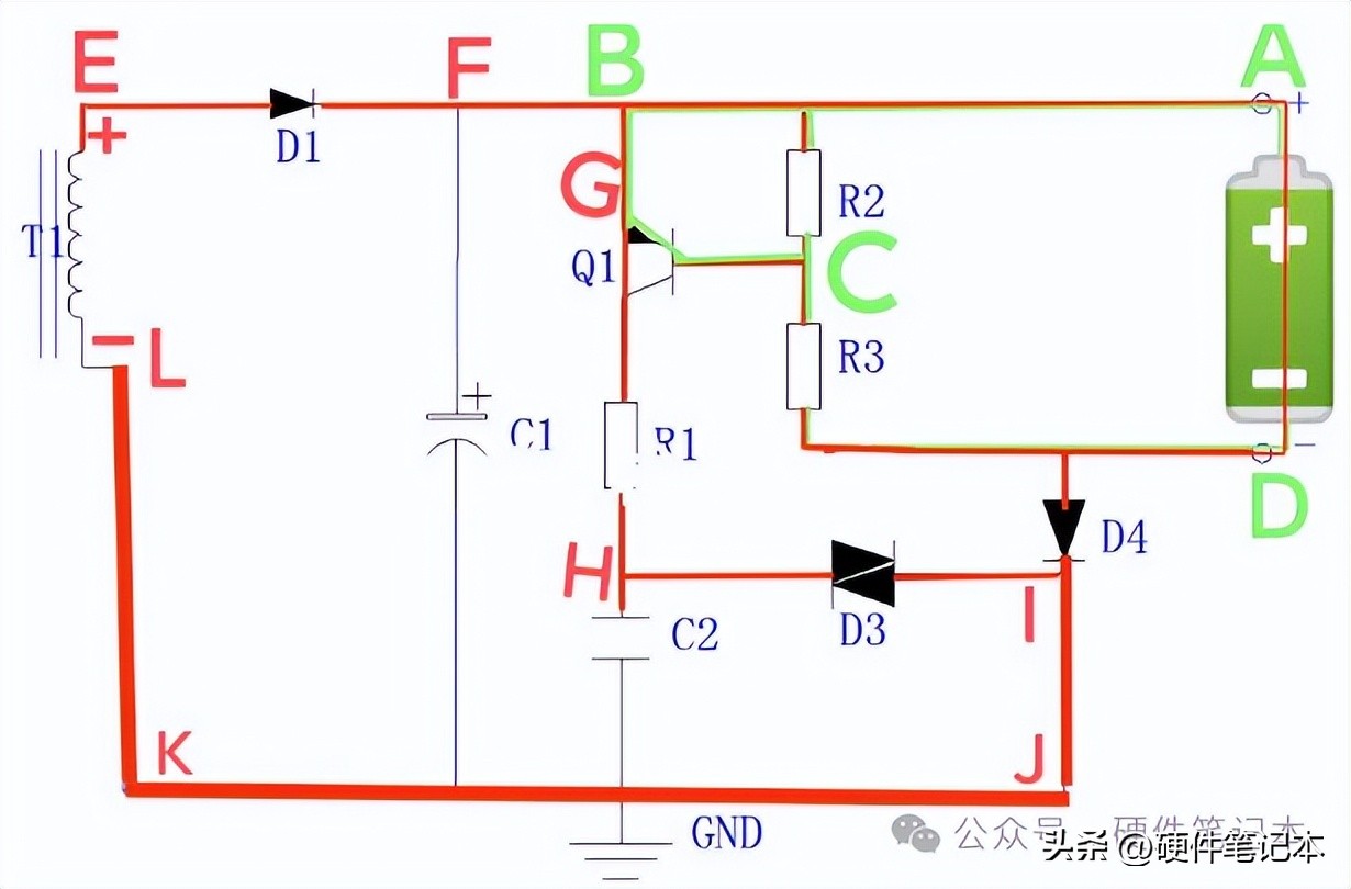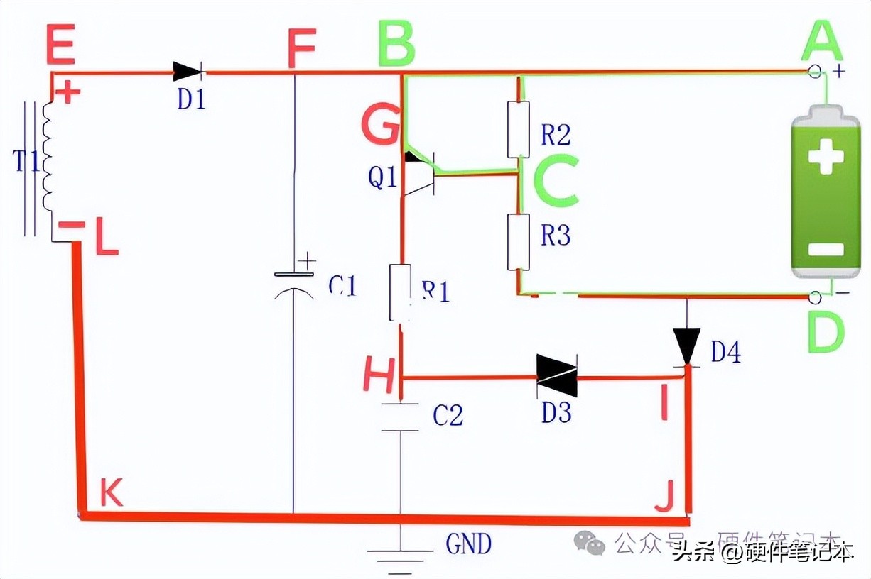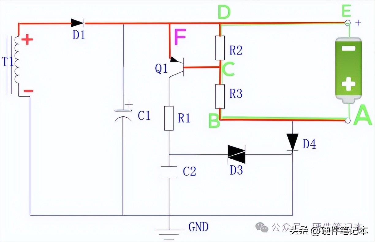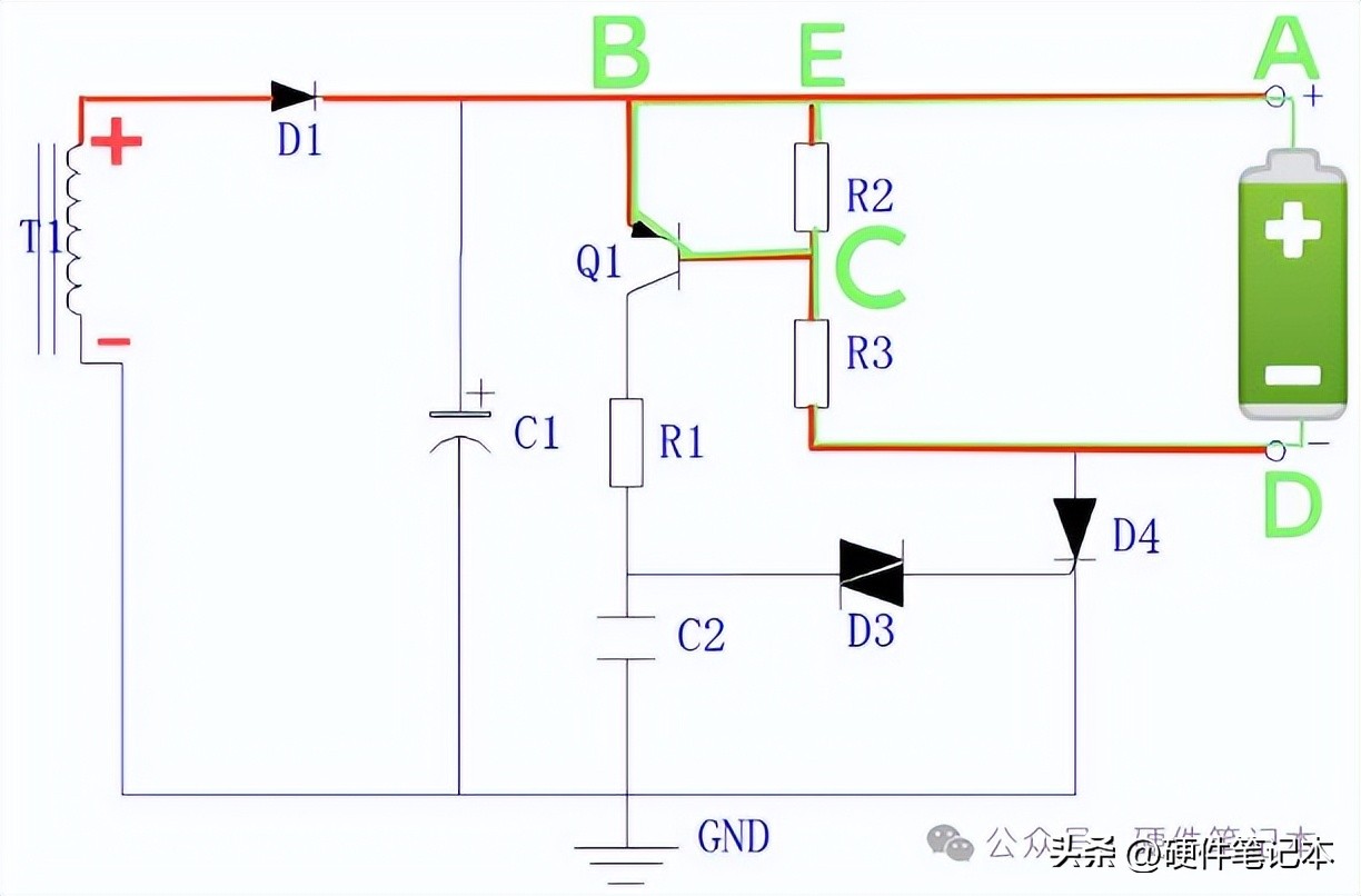 正确的接入充电电池后,电池的电流从正极流出经A、E、C、D点流回电池的负极构成电流回路;这时R2、R3有电流流过,由于串联分压作用,E、B点的电位要高于C点,使Q1发射极的电位高于基极电位,又形成电池的电流从正极流出经A、E、B、Q1发射极、基极、C、D点流回电池的负极,构成又一条电流回路(绿色线路)。