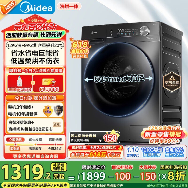 美的滚筒洗衣机12公斤洗烘一体机高性价比优惠