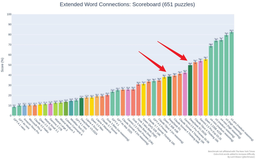 另外,其在 Extended NYT Connections 基准上的成绩也已经出炉,相比于前一代 DeepSeek-R1,最新的 0528 版本的提升非常明显,从 38.6 增至了 49.8,接近 Claude Opus 4 Thinking 16k;不过在该基准上,DeepSeek-R1-0528 仍旧没有挤进 OpenAI o 系列模型占据的第一梯队。