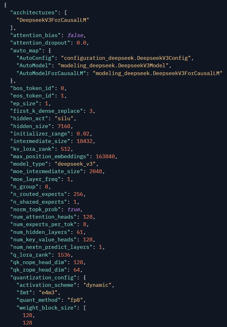 我们也能在新版 DeepSeek-R1 模型的配置文件中看到更多但并不出人意料的信息,包括采用了 DeepSeek-V3 作为基础模型以及 MoE、隐藏层大小、量化等配置。