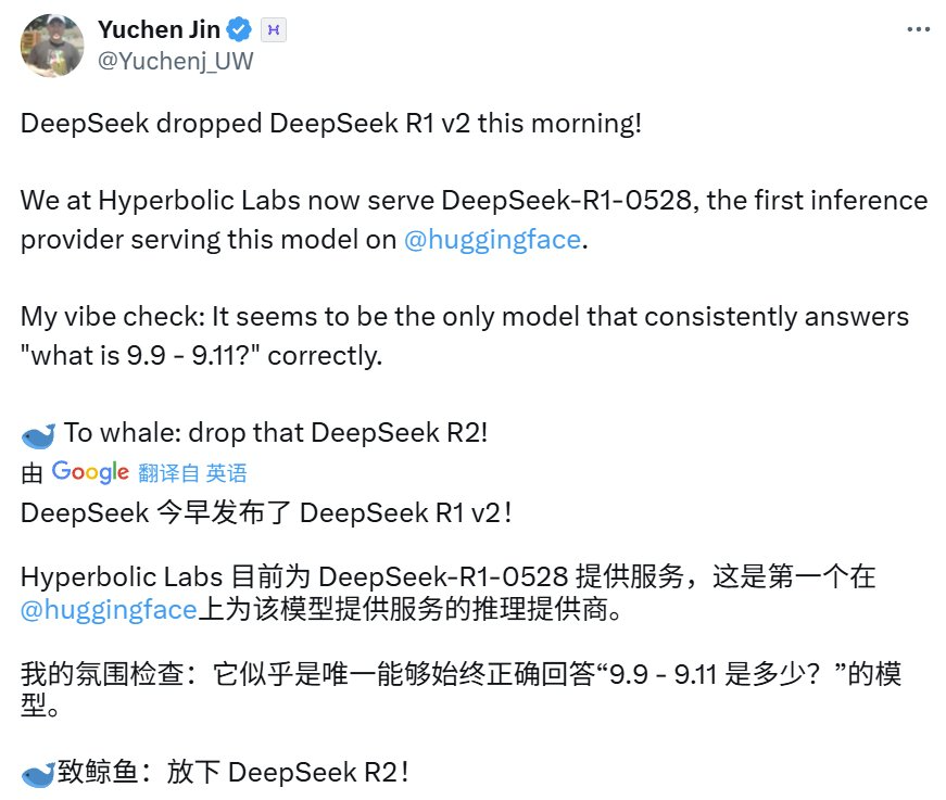 Hyperbolic Labs CTO 和联创 Yuchen Jin 也进行了简单测试,发现 R1-0528 是目前唯一一个始终能正确回答「what is 9.9 - 9.11?」的模型。