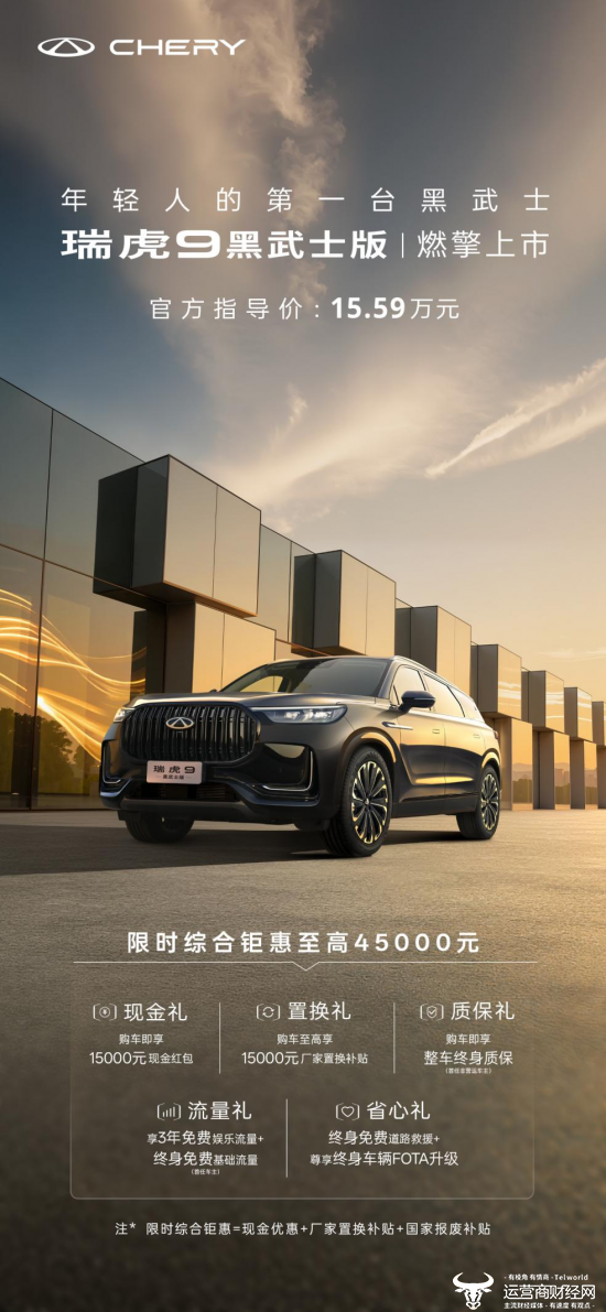 自上市以来,瑞虎9系列便凭借全面且硬核的实力,强势重塑20万级自主旗舰价值标杆。如今,瑞虎9黑武士版携用户共创之力惊艳登场,以更具运动风范的设计与澎湃强劲的动力,为用户解锁更为丰富多元的驾驶乐趣。可以预见,在瑞虎9黑武士版的强势加持下,瑞虎9系列将为更多用户呈上更高品质的出行享受,奏响全新出行乐章。