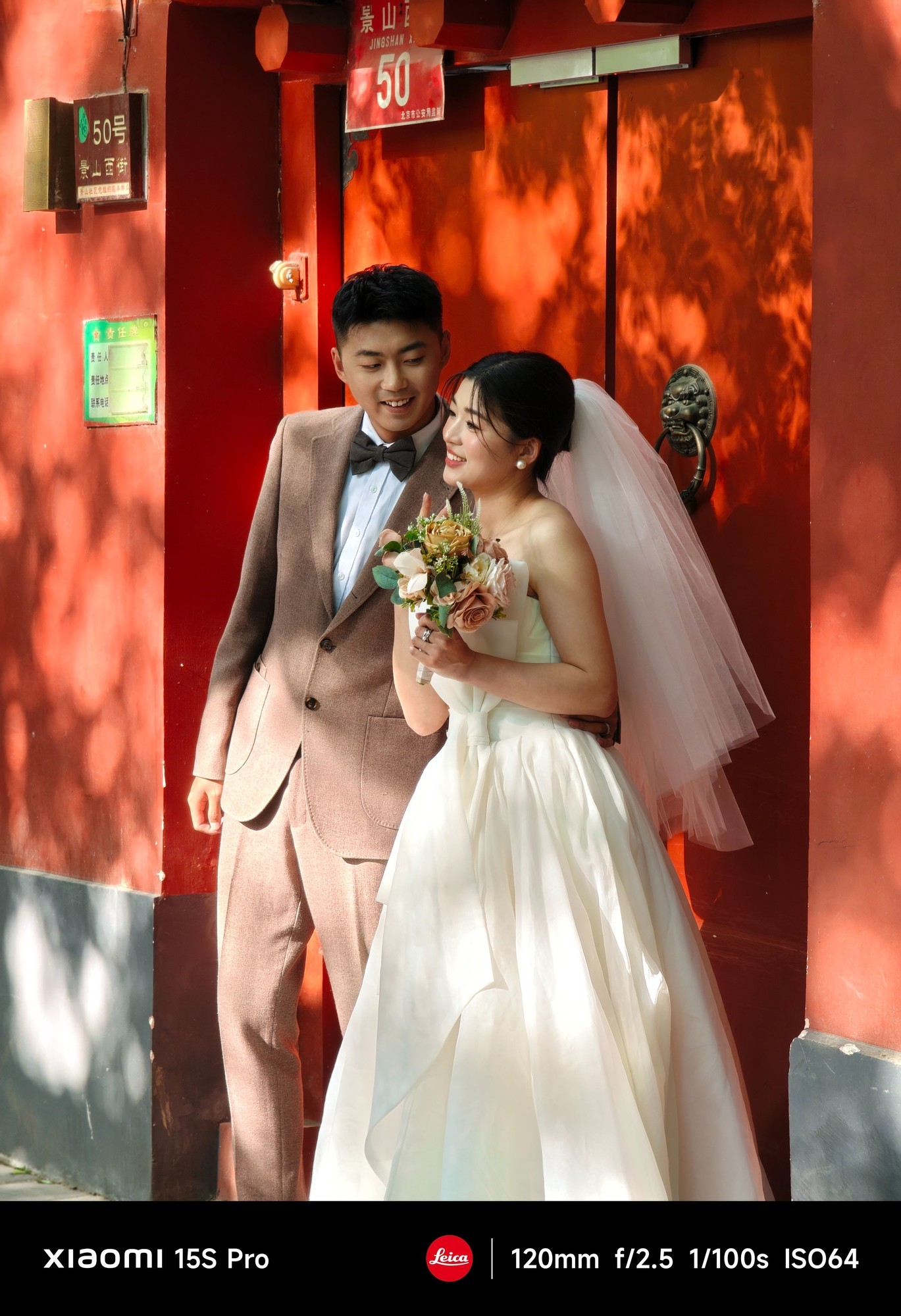 人像方面,上图的长焦人像画面整体清晰度高,人物脸部细节还原到位,连腮红这类细微的妆容都可以很好地呈现。人物的服装纹理,像新娘婚纱的褶皱、新郎西装的面料质感都清晰可辨,细节丰富。阳光洒在人物身上形成自然的明暗过渡,增强了立体感,同时在红墙上形成斑驳树影,加上徕卡的色调,氛围相当棒。
