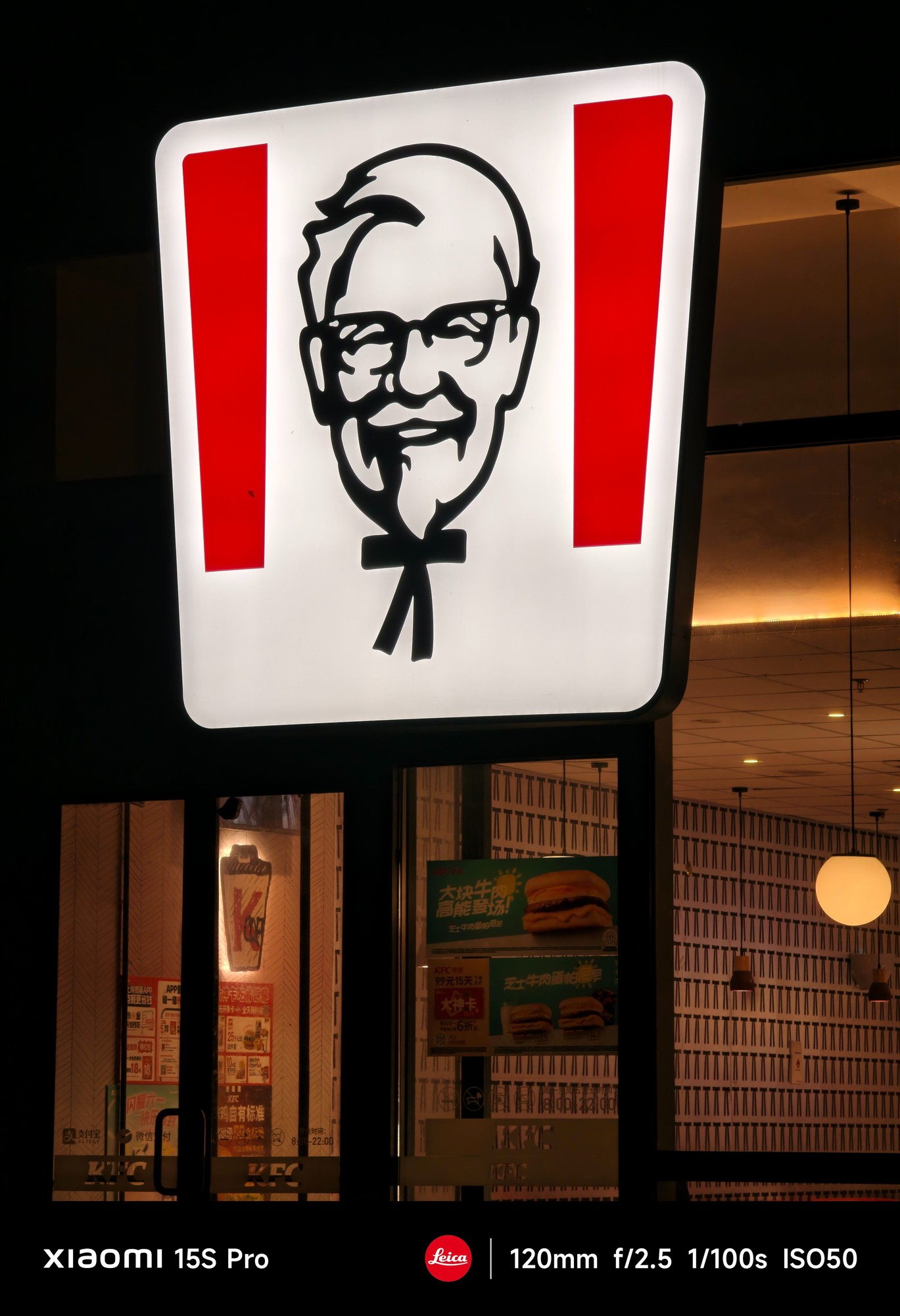 主体招牌明亮清晰,色彩还原准确,红、白、黑三色鲜明,背景虽暗但没有出现明显噪点,画面纯净度高。