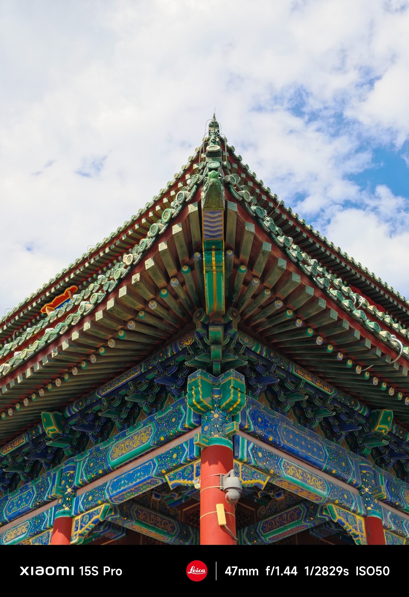 47mm是构图的黄金焦段,建筑的纹理,如古建筑的彩绘、砖瓦结构,以及天空云朵的细节都得到较好呈现,前两张古建筑图片色彩鲜艳且真实,红柱、绿瓦、蓝色彩绘还原到位,蓝天与白云的色彩也自然舒适,没有偏色问题,画面整体曝光准确。
