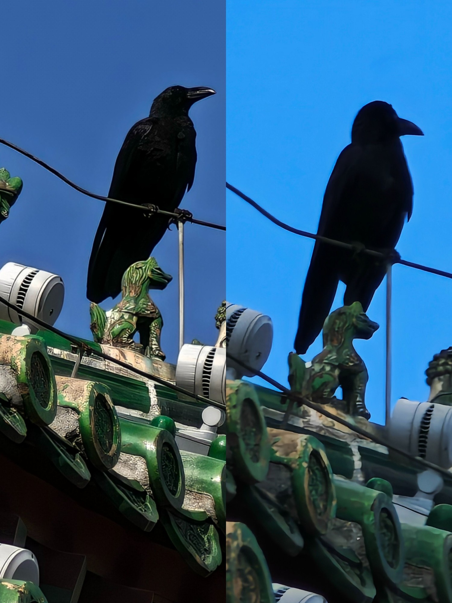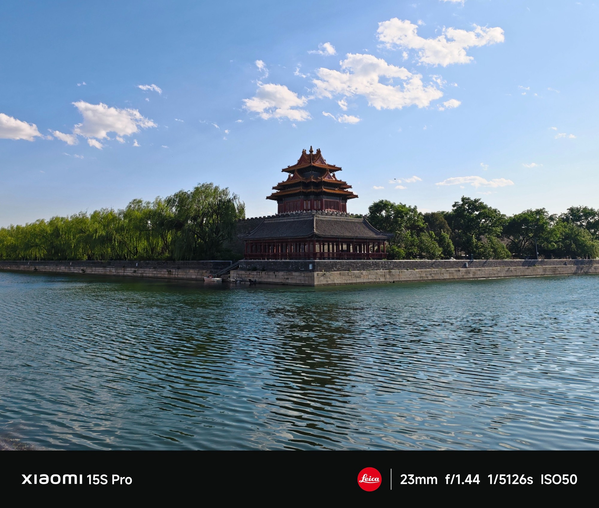 23mm焦段主摄拍摄的这张照片,当时太阳光从镜头侧面斜射过来,形成了侧逆光,光照条件并不算好,但是小米的成片素质依旧很高,建筑的轮廓、飞檐等细节清晰,天空的蓝色、建筑的古色古香以及绿树的颜色都比较自然。