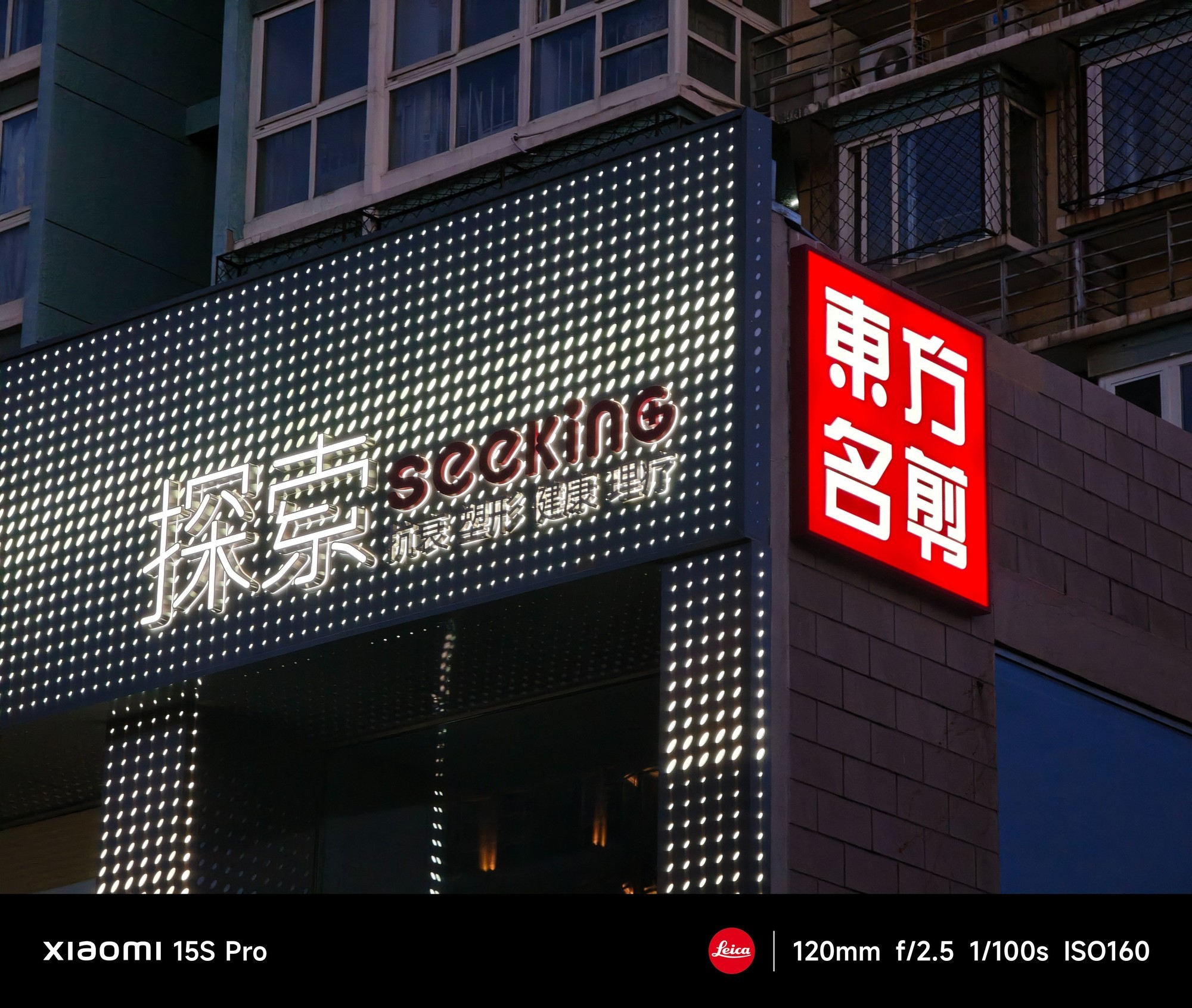 招牌上的文字清晰锐利,招牌上密密麻麻的灯珠明暗全部还原了出来,噪点控制较好,背景建筑细节也有一定呈现。