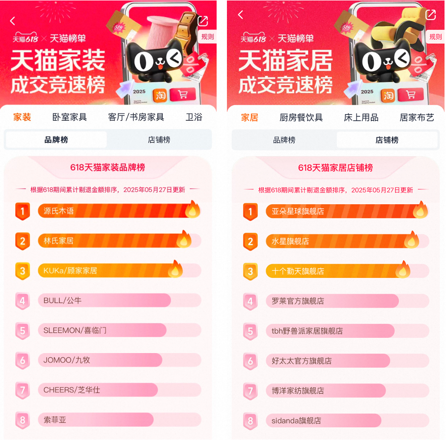家居领域,亚朵星球在新品深睡夏凉被2.0、深睡枕2.0等千万单品的加持下,首次登顶天猫家居榜和床品榜TOP1,为睡眠赛道带来新的活力。十个勤天凭借粉丝效应,通过田园舒适的直播场景,单日直播超8千万,成为此次618开门红的黑马店铺,首次登顶家居榜TOP3。
