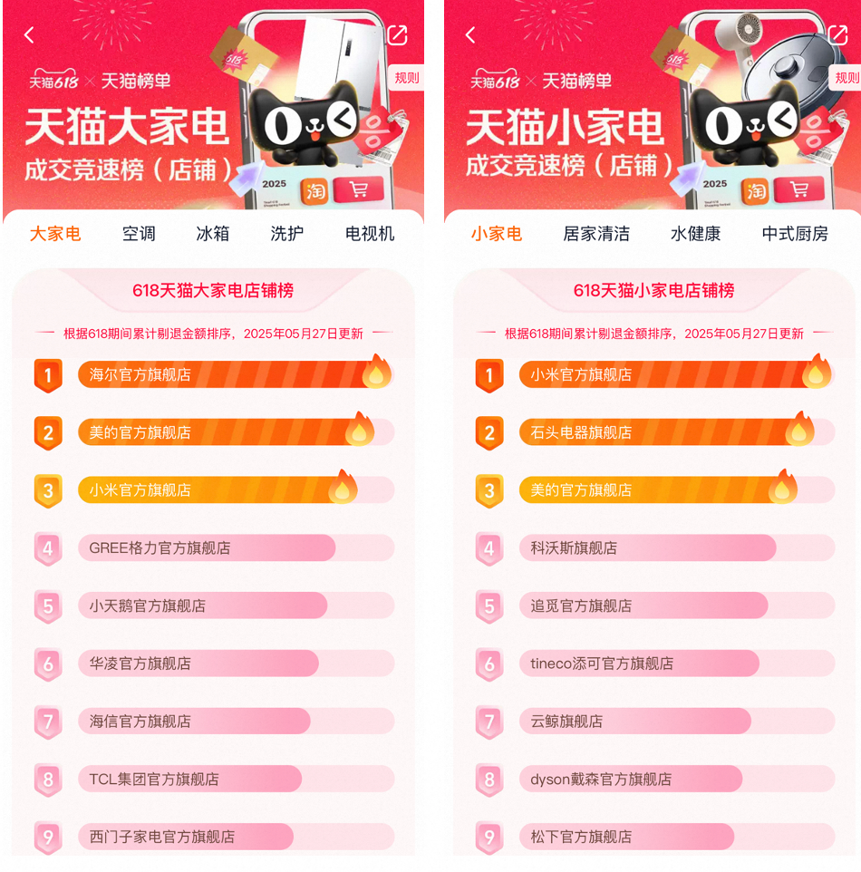 大家电店铺成交排行榜中,海尔官方旗舰店位居榜首,美的、小米、格力、小天鹅官方旗舰店紧随其后;小米官方旗舰店拿下小家电店铺销售榜榜首,石头、美的、科沃斯、追觅旗舰店名列第二名至第五名。