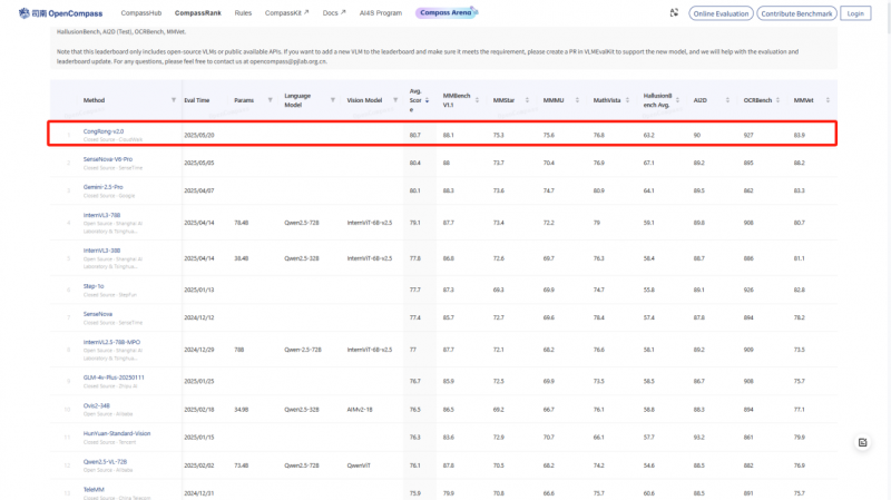 近日,云从科技自主研发的从容大模型在国际权威评测平台OpenCompass最新全球多模态榜单中,以80.7分的综合成绩登顶榜首。