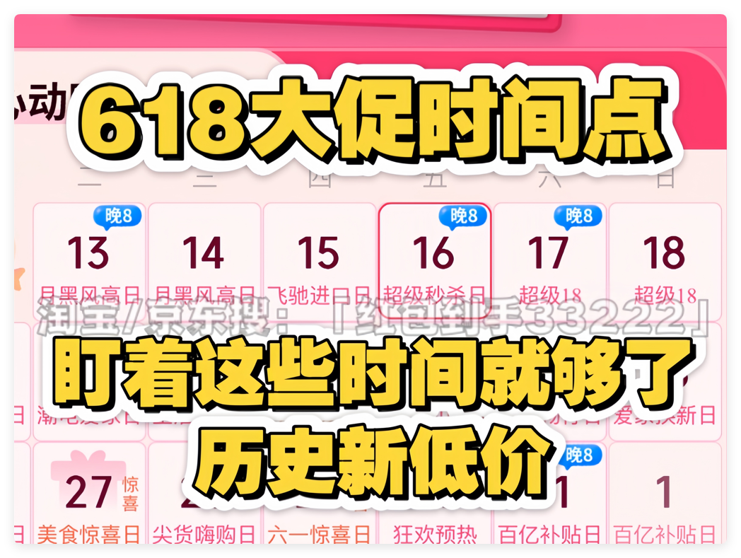 - 6月18日:进入狂欢高潮期,跨店满减力度最大(京东每满299减50、淘宝每满300减50),叠加红包雨、国家补贴后,部分商品折扣低至5折。