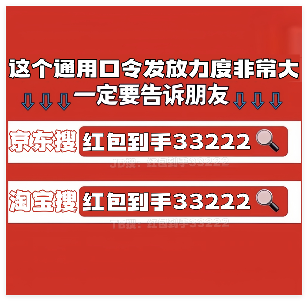 - 淘宝口令:搜索“红包到手33222”每日领1次,连续7天必中10元+。