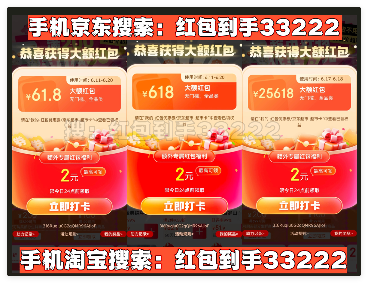 首先,划重点!今年天猫/淘宝和京东的618红包口令都是「红包到手33222」要记住!领的红包大小和你搜索的什么口令有关的!这个双平台通用口令包领到大的!记得每天去领!