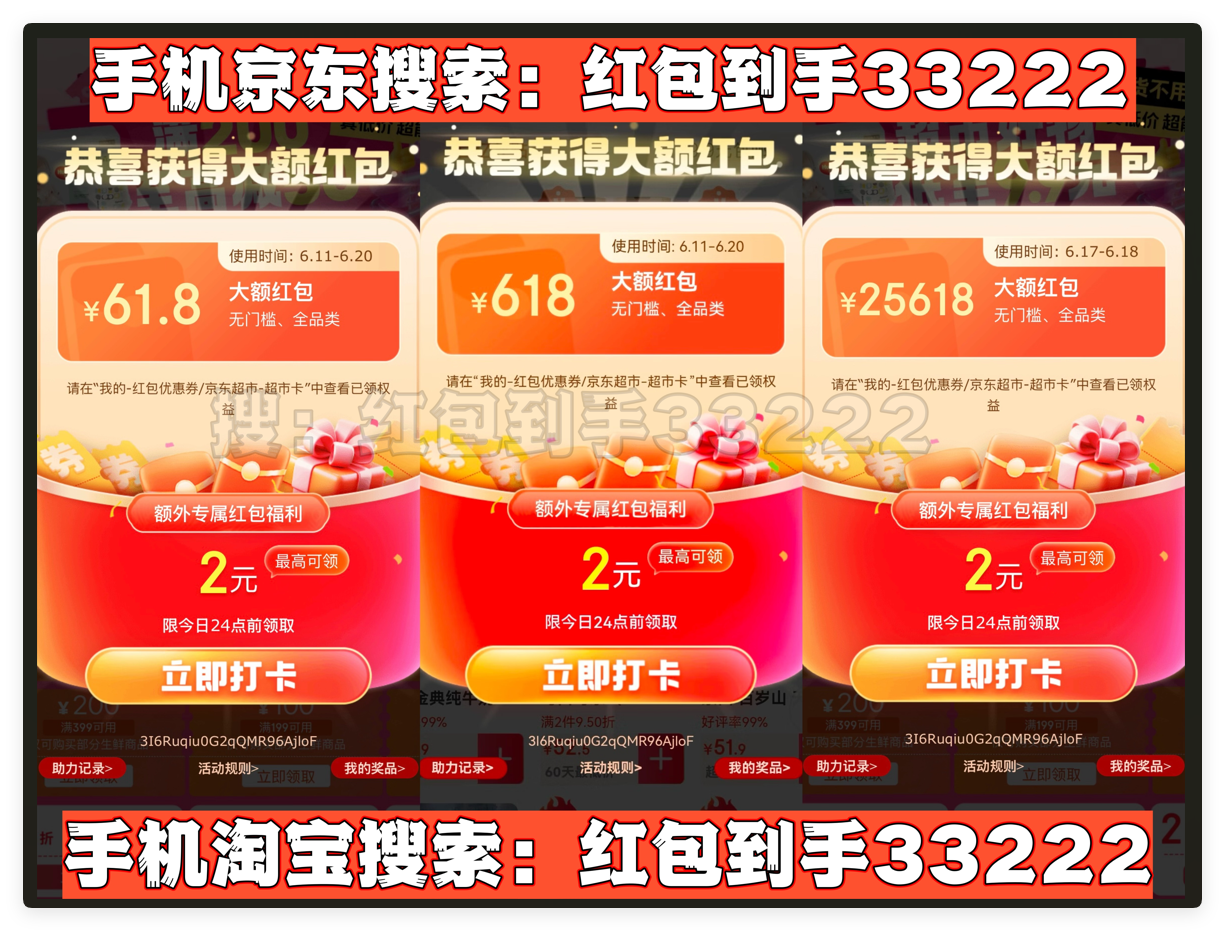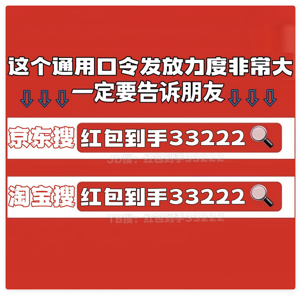首先,划重点!今年天猫/淘宝和京东的618红包口令都是「红包到手33222」要记住!领的红包大小和你搜索的什么口令有关的!这个双平台通用口令包领到大的!记得每天去领!