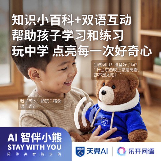 AI智伴玩偶在交互上实现突破,无需按压唤醒,小朋友只要拿起小熊即可随时对话。依托中国电信自研的星辰大模型,天翼AI还打造了儿童对话智能体,以确保玩偶与儿童的沟通健康、生动。AI智伴玩偶不仅能用生动的例子和简单易懂的语言解答孩子的每一个“为什么”,还可以陪伴他们背诗词、做算术、了解文化习俗,全面激发他们的好奇心与求知欲。